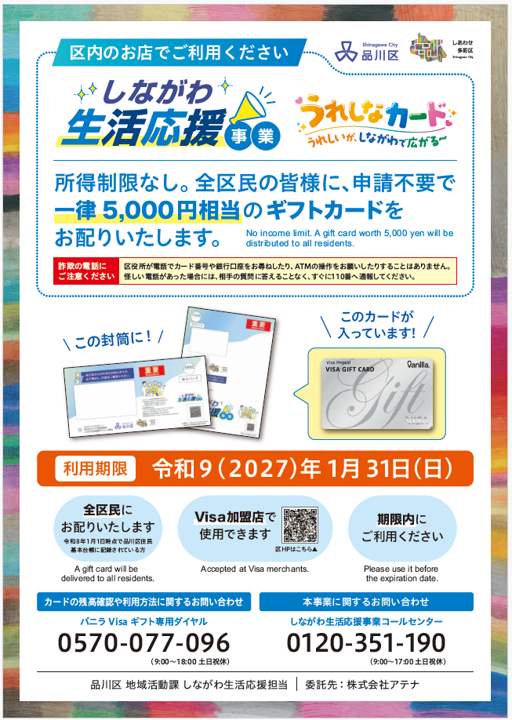 品川区で全区民を対象に5,000円相当のギフトカードを配布する「しながわ生活応援事業」を実施いたします。